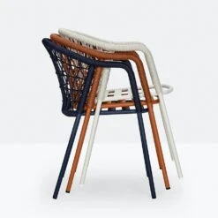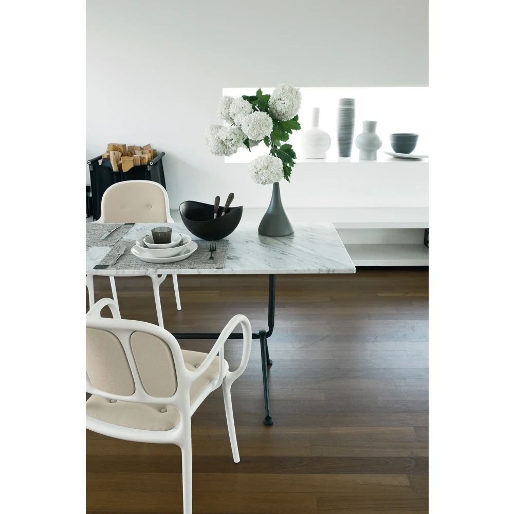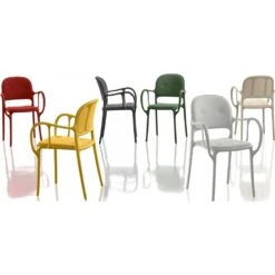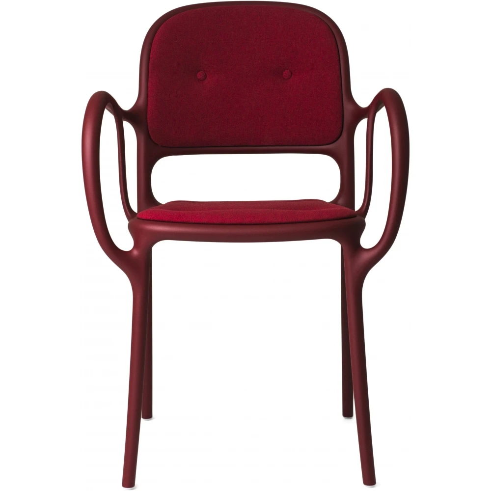 Stuhl mit Armlehnen. Aus Polypropylen mit Glasfaserzusatz. Luftgeformt. Seidenglänzende Oberfläche. Sitz-/Rückenkissen aus expandiertem Polyurethan mit Stoffbezug (Fidivi „King L Kat“ und „King L“).