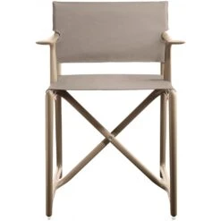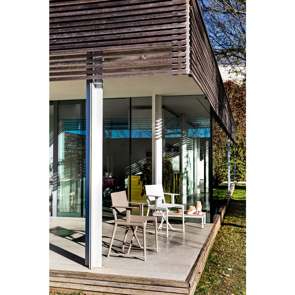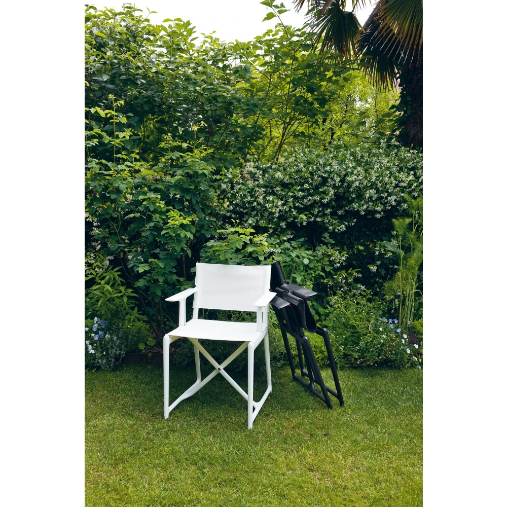 Klappbarer Regiestuhl. Material: Polypropylen mit Glasfaserzusatz. Sitz und Rückenlehne aus Stoff (Plastitex „THINNY_NEW YORK“). Geeignet für den Einsatz im Freien.