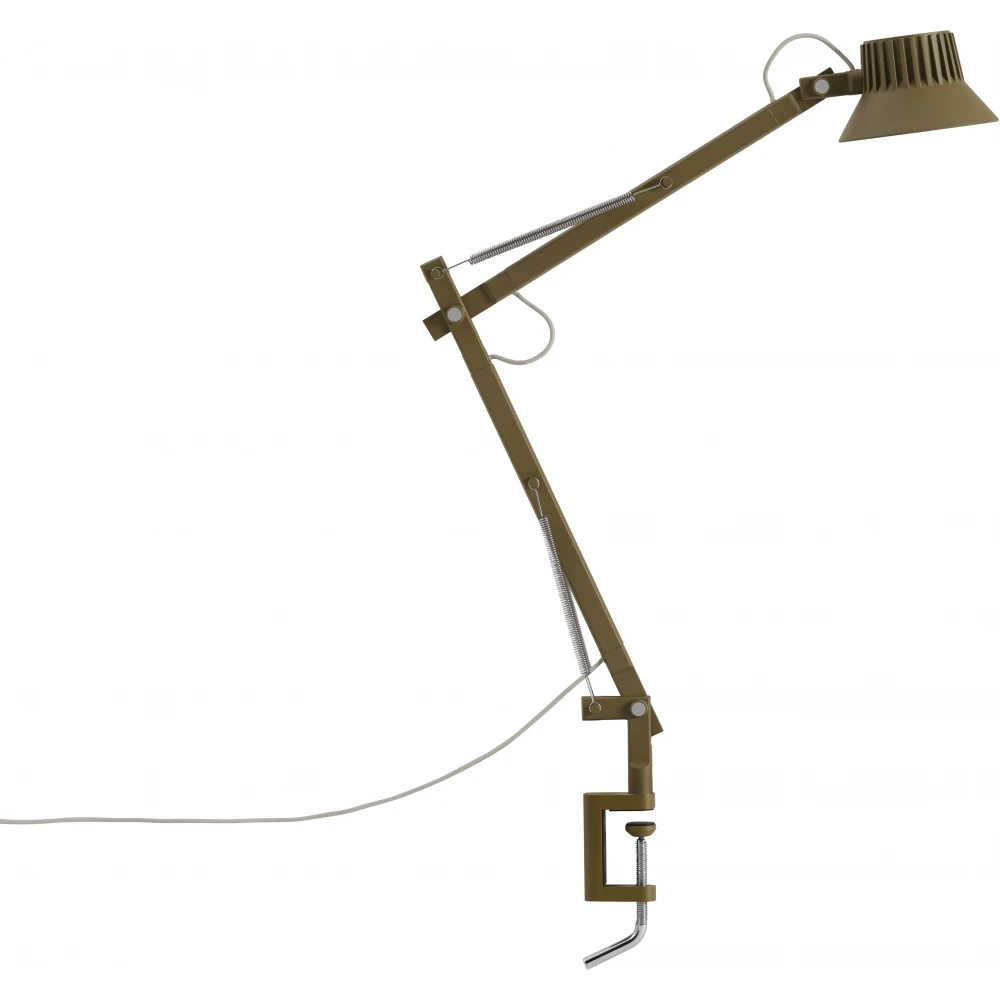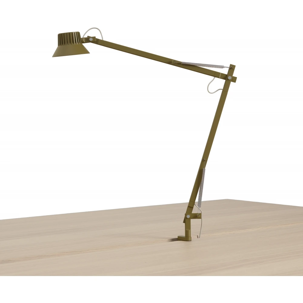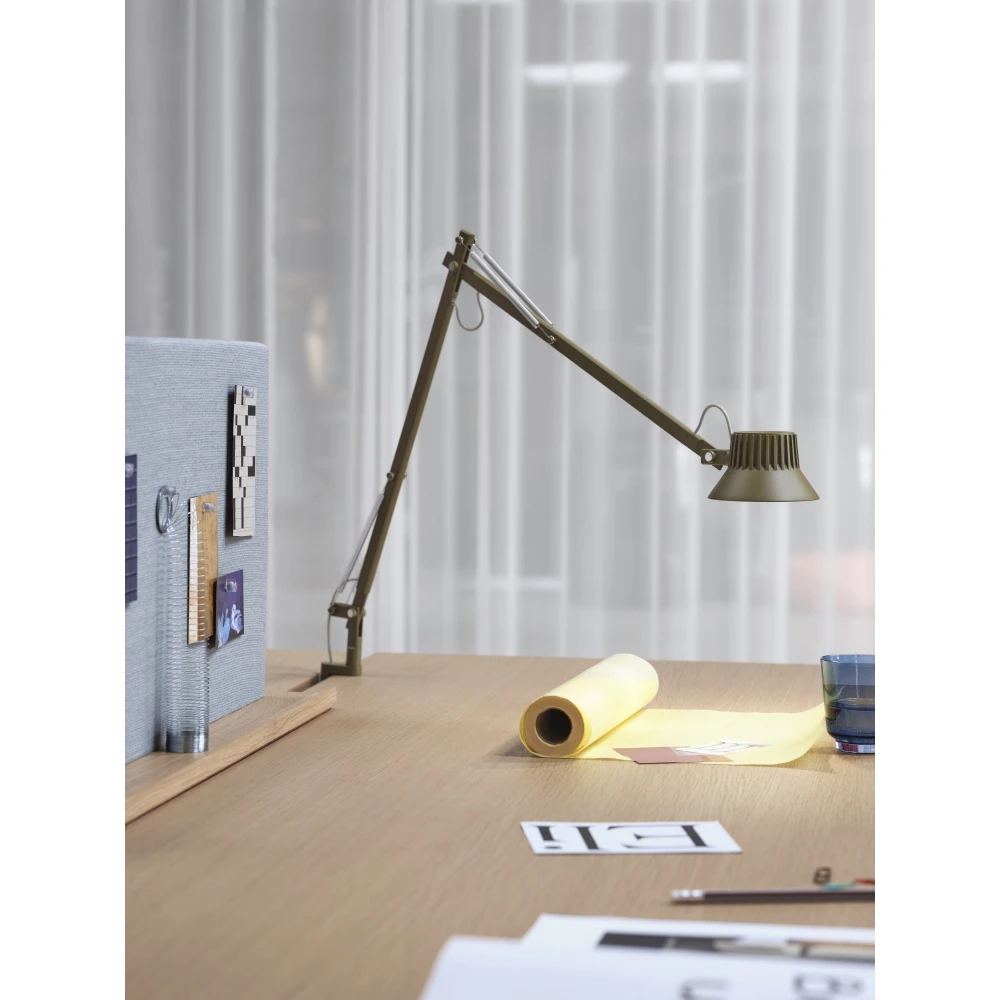 | Material | Kopf und Scharniere: druckgegossenes Aluminium, Leuchtenarme: stranggepresstes Aluminium, pulverbeschichtet. Diffusor: spritzgegossener Kunststoff. Tischfuß: bearbeiteter Stahl. Klemme: Aluminiumdruckguss und Schraube: Edelstahl – Stift: Schraube und Befe |