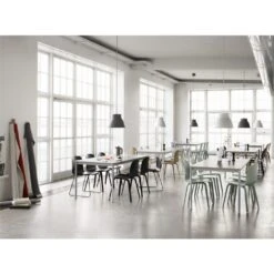 Der Visu Chair bringt Leichtigkeit ins Design und kombiniert eine einfache und bequeme Form mit einer ruhigen Silhouette. Die Schale ist aus formgepresstem Furnier hergestellt, während die Beine für eine schlanke und dennoch stabile Basis. Muuto wechselt bei einer Reihe bereits bestehender Produkte zu Lacken auf Wasserbasis, die weniger Chemikalien ausstoßen als herkömmliche Lacke. Sie sorgen so für ein besseres Raumklima und dadurch auch für bessere Arbeitsbedingungen in der Produktionsphase. Kratz-, Lackqualitätssowie Splittertests wurden durchgeführt, um weiterhin höchste Qualität zu garantieren.