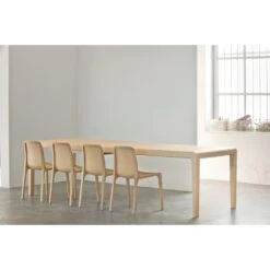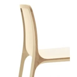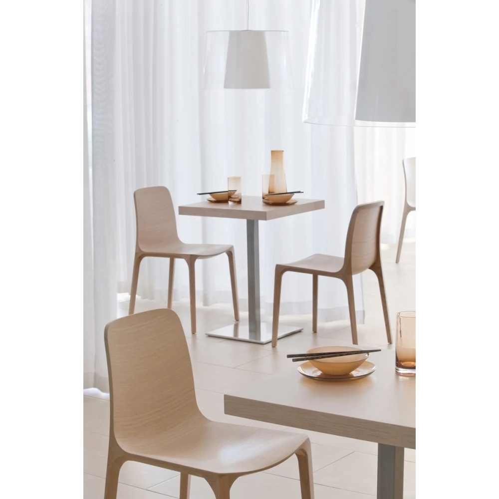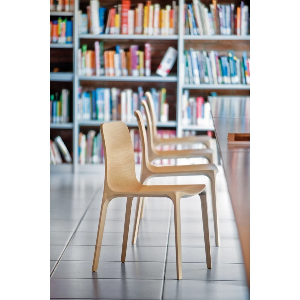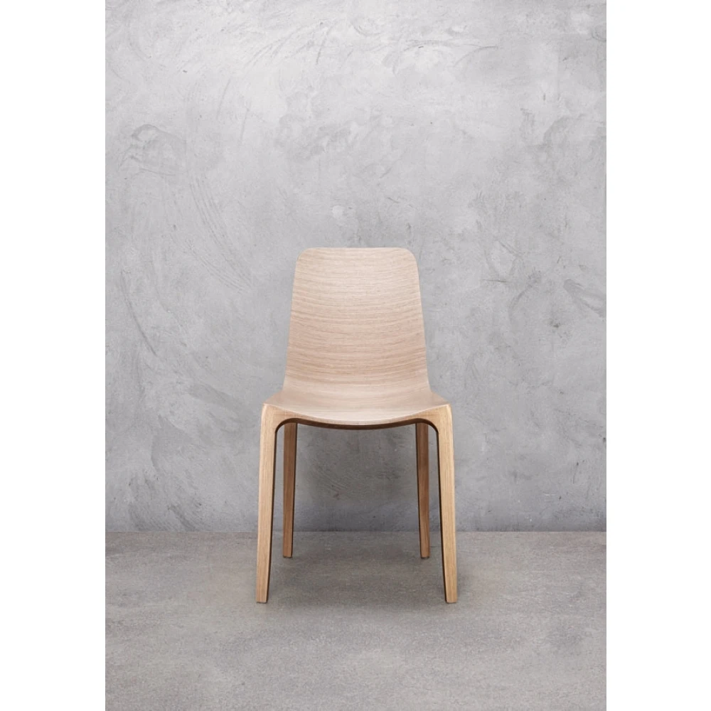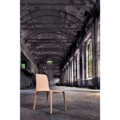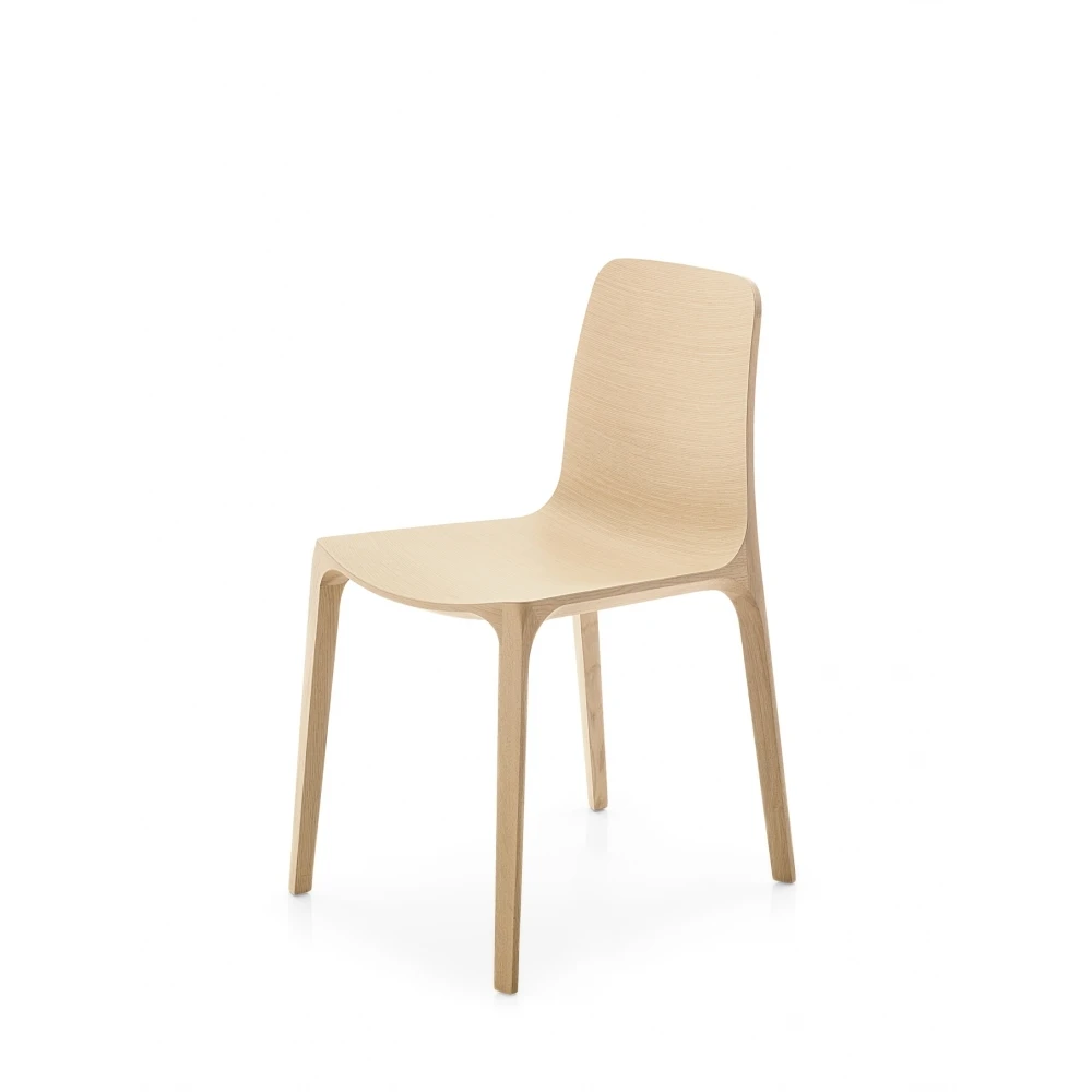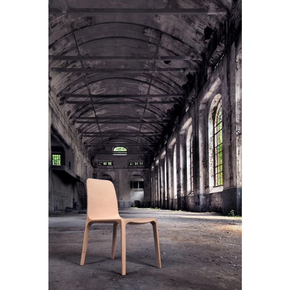 Der Stuhl Frida birgt erfinderische High-Tech und stellt ein Bravourstück in der Holzverarbeitung dar. Die Kombination einer dreidimensionalen, nur 3,5 mm starken Schale aus Multiplex mit einem Massivholzgestell macht seine entscheidende Besonderheit aus. Das Gestell aus Eichenholz ist von geometrischen Elementen aus verschiedenen Formen gekennzeichnet, die sich an den Rändern entlangziehen und diese schmälern. Dadurch entsteht ein Eindruck der Leichtigkeit, die die konzeptuelle Kraft der Sitzschale hervorhebt.