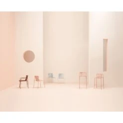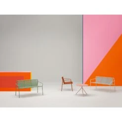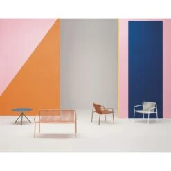 Tribeca entstand aus der Erinnerung mit Ihren beruhigenden Echos, einer modernen Neuinterpretation der klassischen Sixties-Terrassenstühle aus geflochtenem Stahl. Gartenmöbel mit Gestell aus Rohr, Ø20mm, lackiert für den Außenbereich, Rückenlehne und Sitz mit vertikaler Bespannung aus extrudiertem PVC mit Nylonkern. Speziell für den Einsatz im Freien entwickelt.