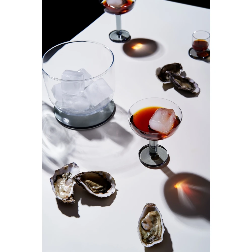 Der Tom Dixon Eiskübel besteht aus mundgeblasenem Glas versehen mit einem Hauch von Rauchfarbe. Minimal und schwergewichtig, die Puck-Kollektion ist widerstandsfähig genug, um in einer professionellen Cocktailumgebung zu überleben.